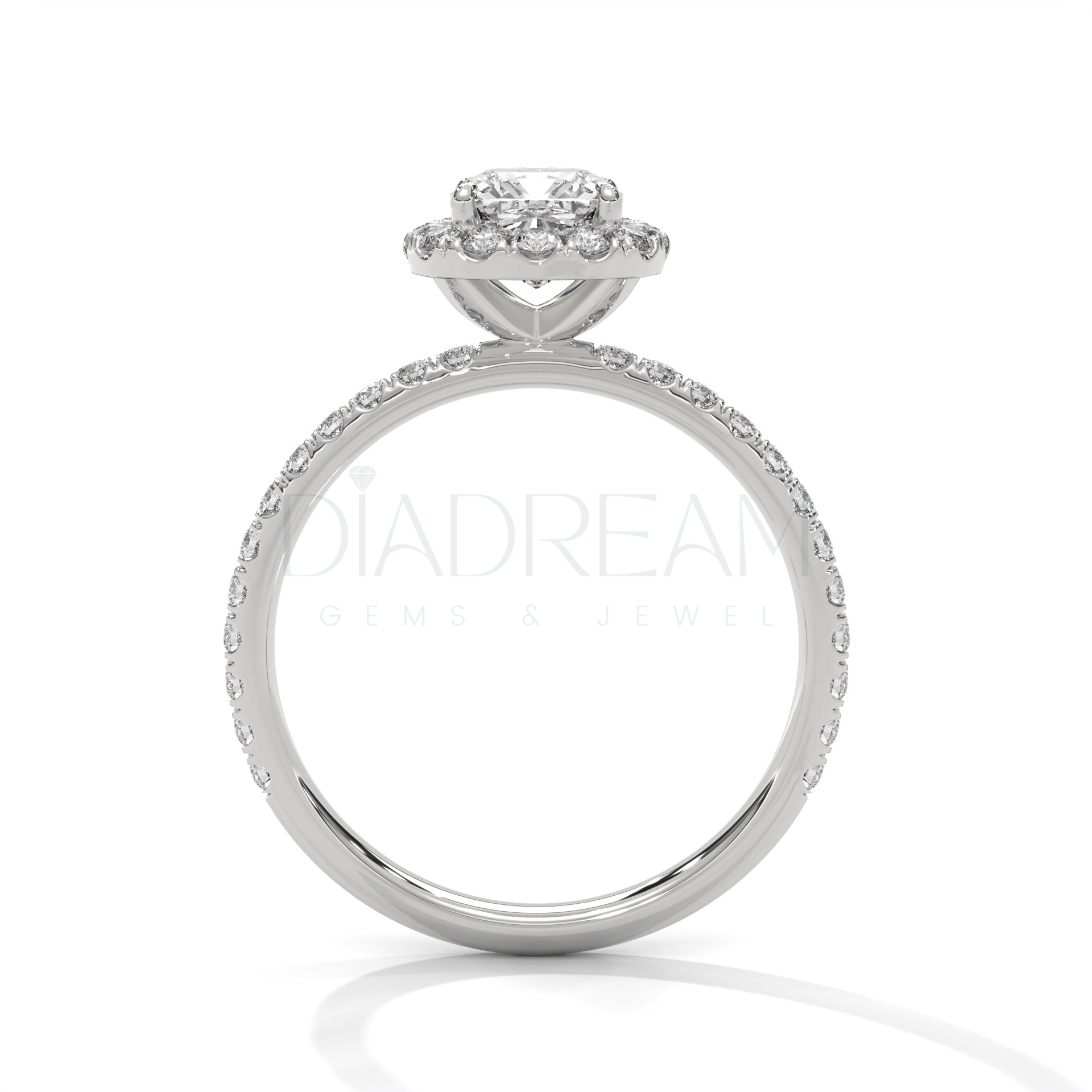 At the heart of this stunning ring lies a lab-grown Cushion Cut Moissanite and Cubic Zirconia diamond, weighing approximately 2.0 carats. Boasting a colorless hue and VVS clarity, this gemstone radiates a fire and brilliance comparable to natural diamonds, ensuring you shine in every moment.