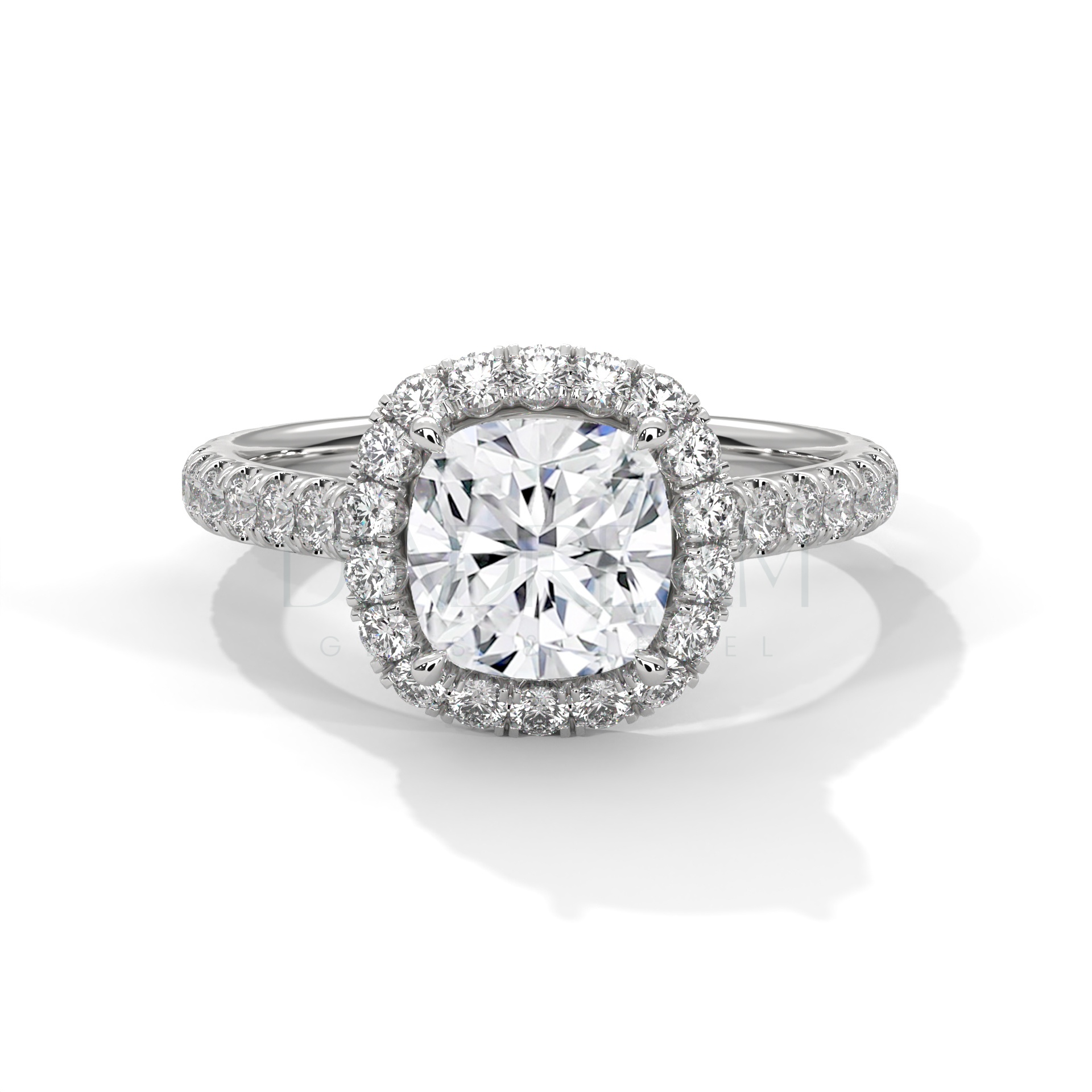Indulge in the brilliance of our cushion cut moissanite Halo and Pave ring, a masterpiece of craftsmanship and elegance. Showcasing a dazzling 2.00 carat (approx.) cushion-cut moissanite, this ring is a symbol of timeless elegance and sophistication. The colorless, VVS clarity, and ideal cut of the moissanite ensure a breathtaking display of light and fire.