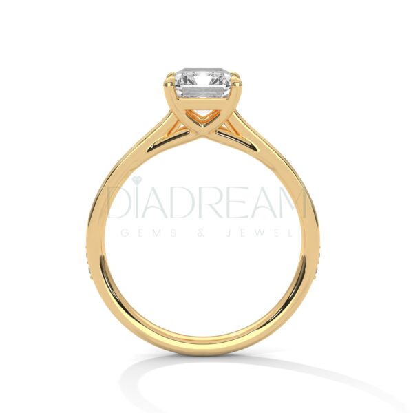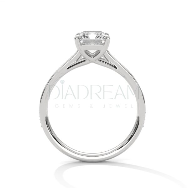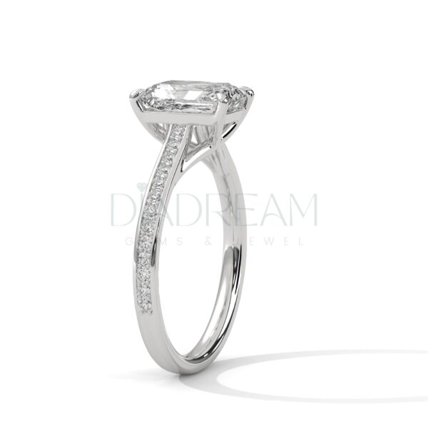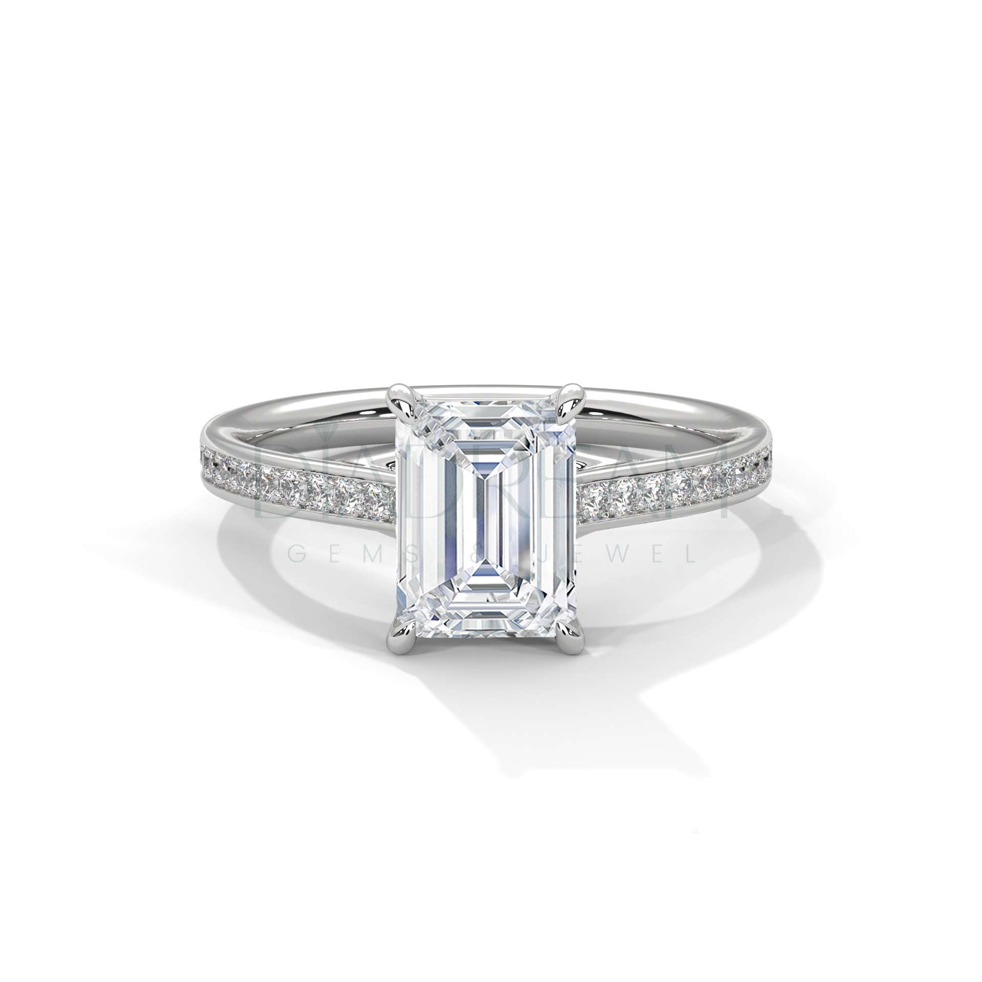 Indulge in the timeless elegance of our emerald cut moissanite ring. This exquisite piece, meticulously handcrafted by our skilled artisans, showcases a stunning 2.00-carat (approx.) emerald-cut moissanite. Renowned for its exceptional brilliance and fire, the colorless VVS clarity and ideal cut of this lab-grown gem ensure a dazzling display of light.