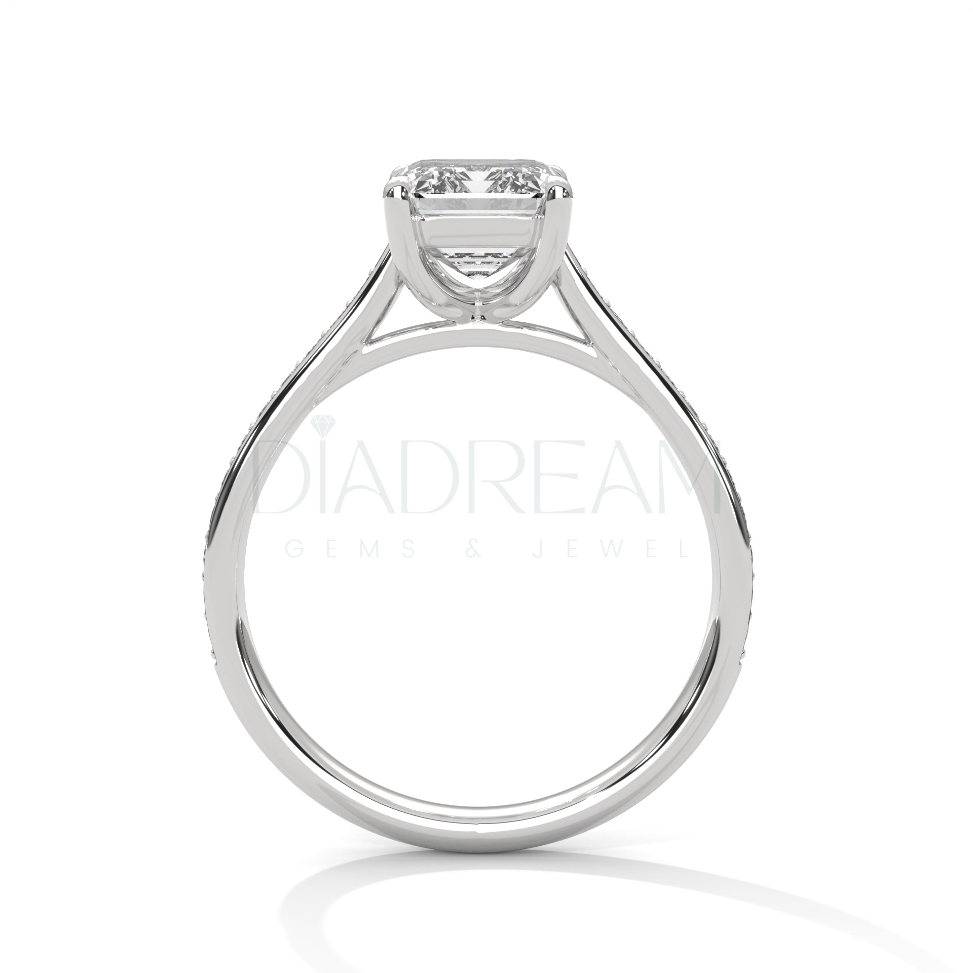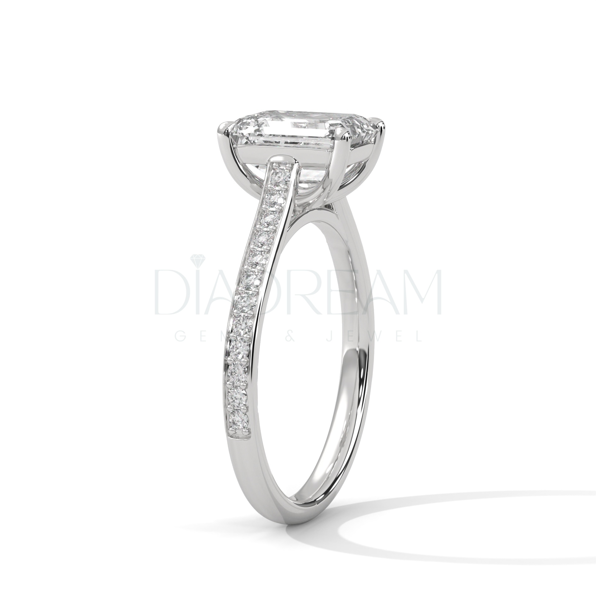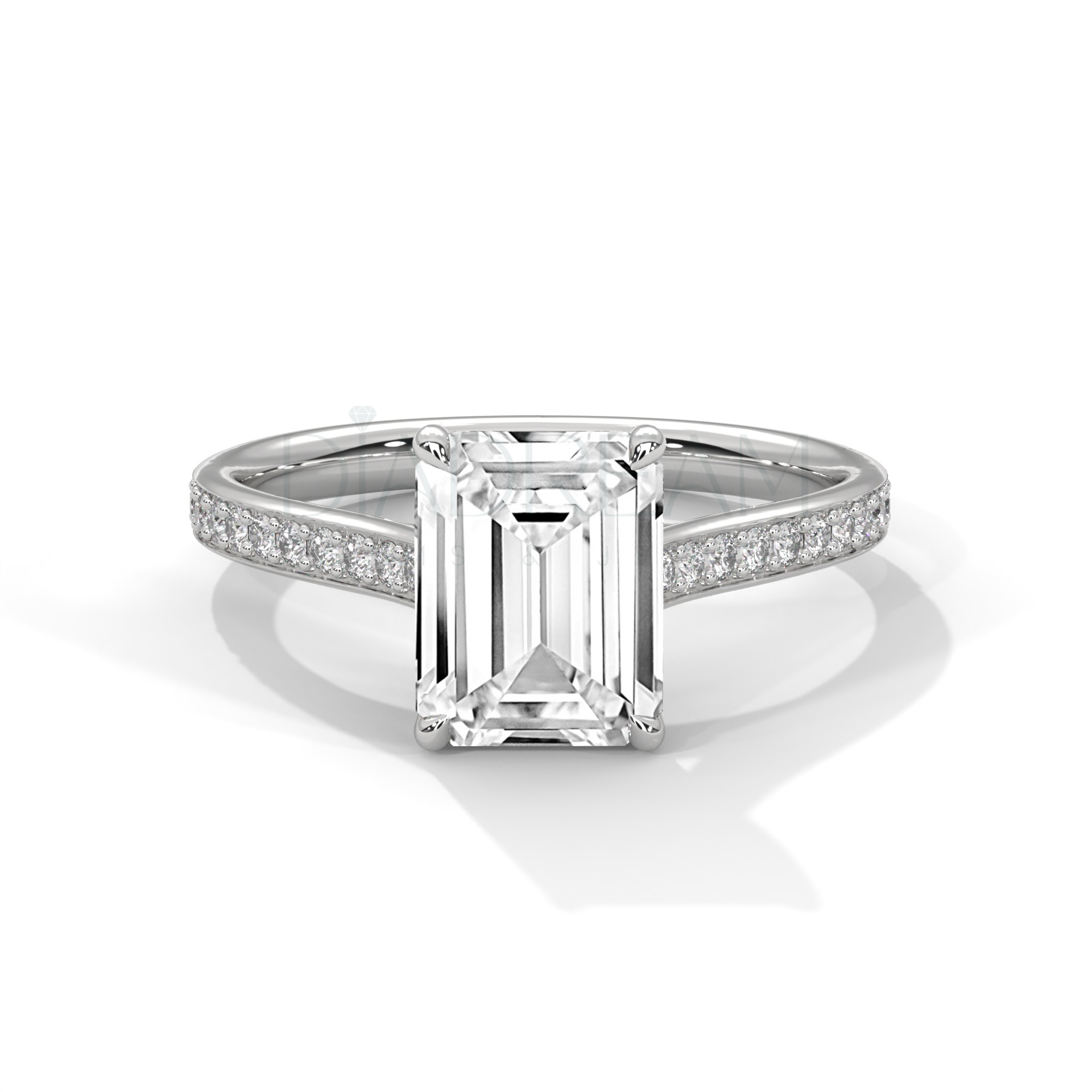 Indulge in the timeless beauty of our 2 carat emerald cut moissanite ring, a masterpiece of craftsmanship and elegance. Showcasing a captivating 2.00 carat (approx.) emerald-cut moissanite, this ring is a symbol of sophistication and refined style. The colorless, VVS clarity, and ideal cut of the moissanite ensure a breathtaking display of light and fire, creating a mesmerizing spectacle of brilliance.