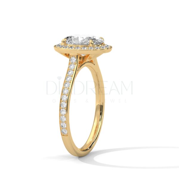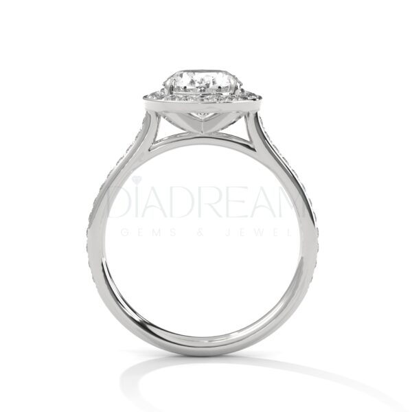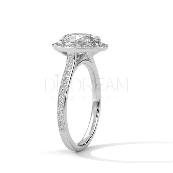 This exquisite ring is further enhanced by a halo of sparkling round-cut moissanite side stones. This creates a breathtaking display of brilliance. The interplay of the center stone and the surrounding halo of diamonds creates a captivating symphony of light and shadow, enhancing the overall sparkle and radiance of the ring.