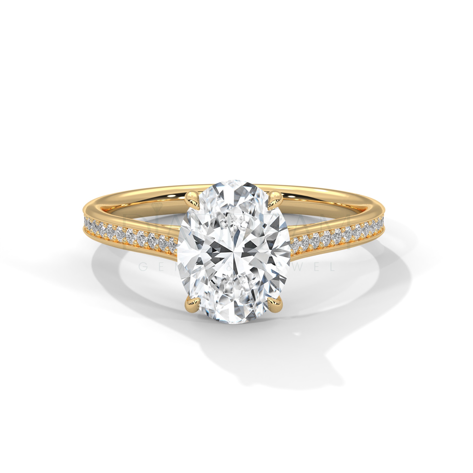 Indulge in the timeless beauty of our 2 carat oval cut moissanite ring. Showcasing a captivating 2.00 carat (approx.) oval-cut moissanite, this ring is a symbol of sophistication and refined style. The colorless, VVS clarity, and ideal cut of the moissanite ensure a breathtaking display of light and fire, creating a mesmerizing spectacle of brilliance.