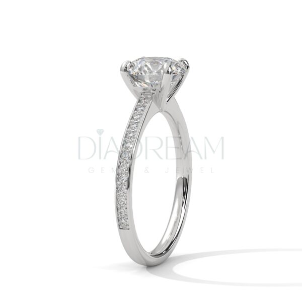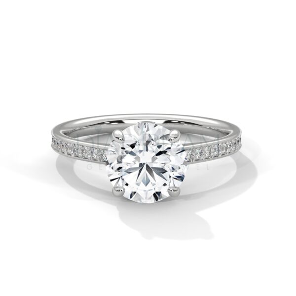 Imagine a ring that captures the essence of elegance and brilliance. This Pave moissanite and cubic zirconia diamond ring is that very piece. It features a captivating 2.00-carat, round-cut center stone surrounded by a halo of smaller, sparkling diamonds.