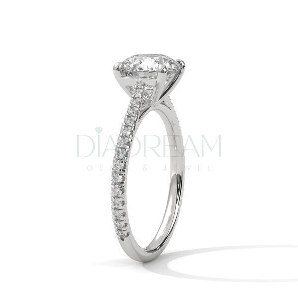 The center stone, a moissanite and cubic zirconia diamond, boasts exceptional colorless hue and VVS clarity, rivaling the beauty of natural diamonds. Its brilliance is further enhanced by the surrounding halo of smaller diamonds, creating a mesmerizing display of light and sparkle.