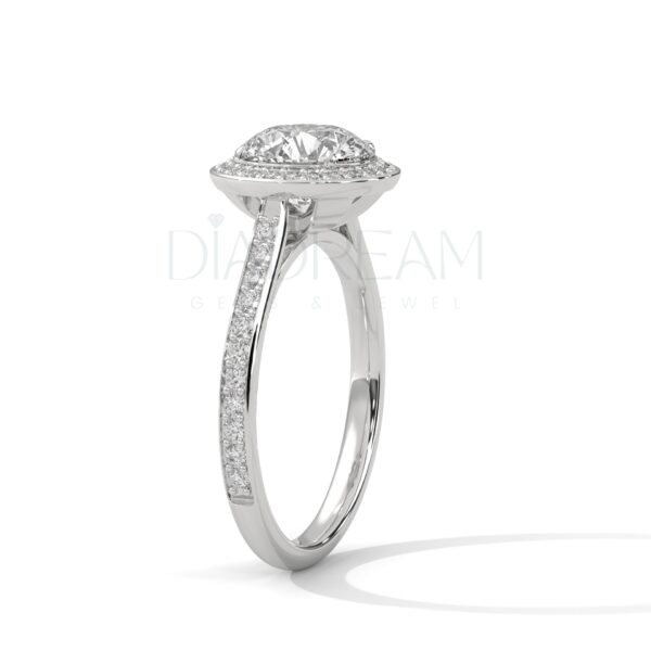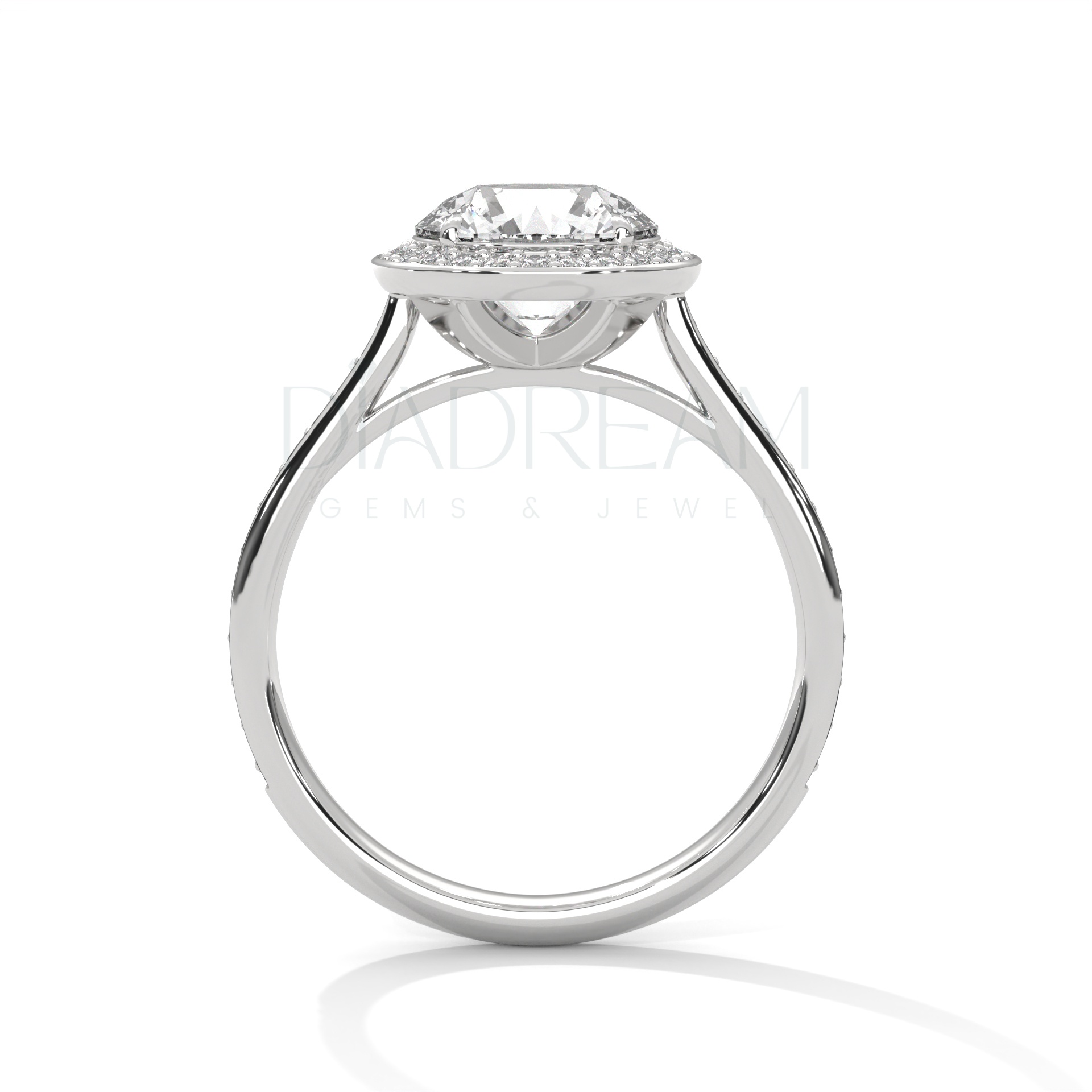 In addition, this exquisite ring is further enhanced by a halo of sparkling round-cut moissanite side stones. This creates a breathtaking display of brilliance. Consequently, the interplay of the center stone and the surrounding halo of diamonds creates a captivating symphony of light and shadow, enhancing the overall sparkle and radiance of the ring.