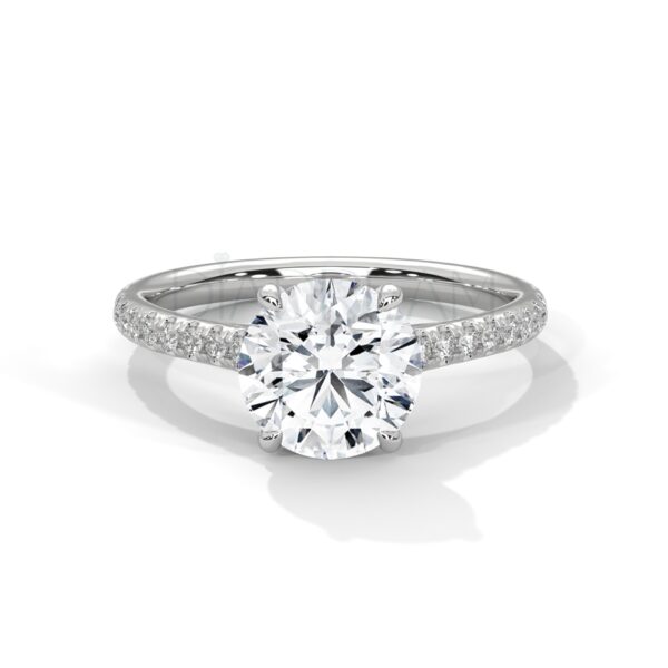 The centerpiece of this ring features a brilliant 2.0 CT Round Cut Moissanite and Cubic Zirconia diamond, grown through an advanced lab process. Its colorless appearance and VVS clarity make it indistinguishable from natural diamonds, delivering extraordinary sparkle and fire. The classic round cut enhances its brilliance, ensuring it catches the light from every angle.