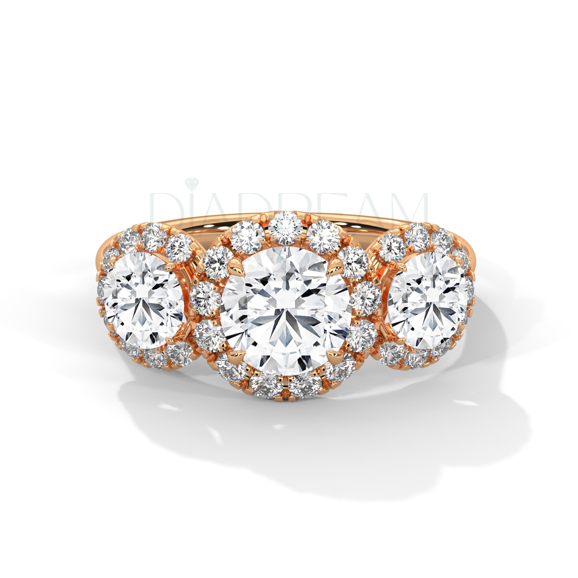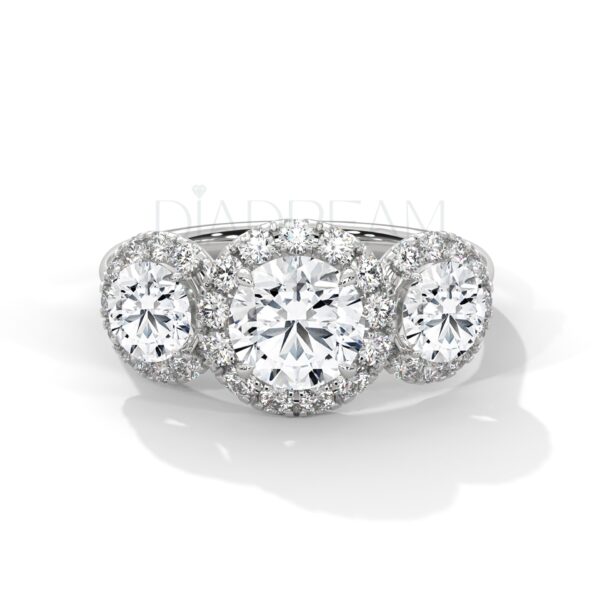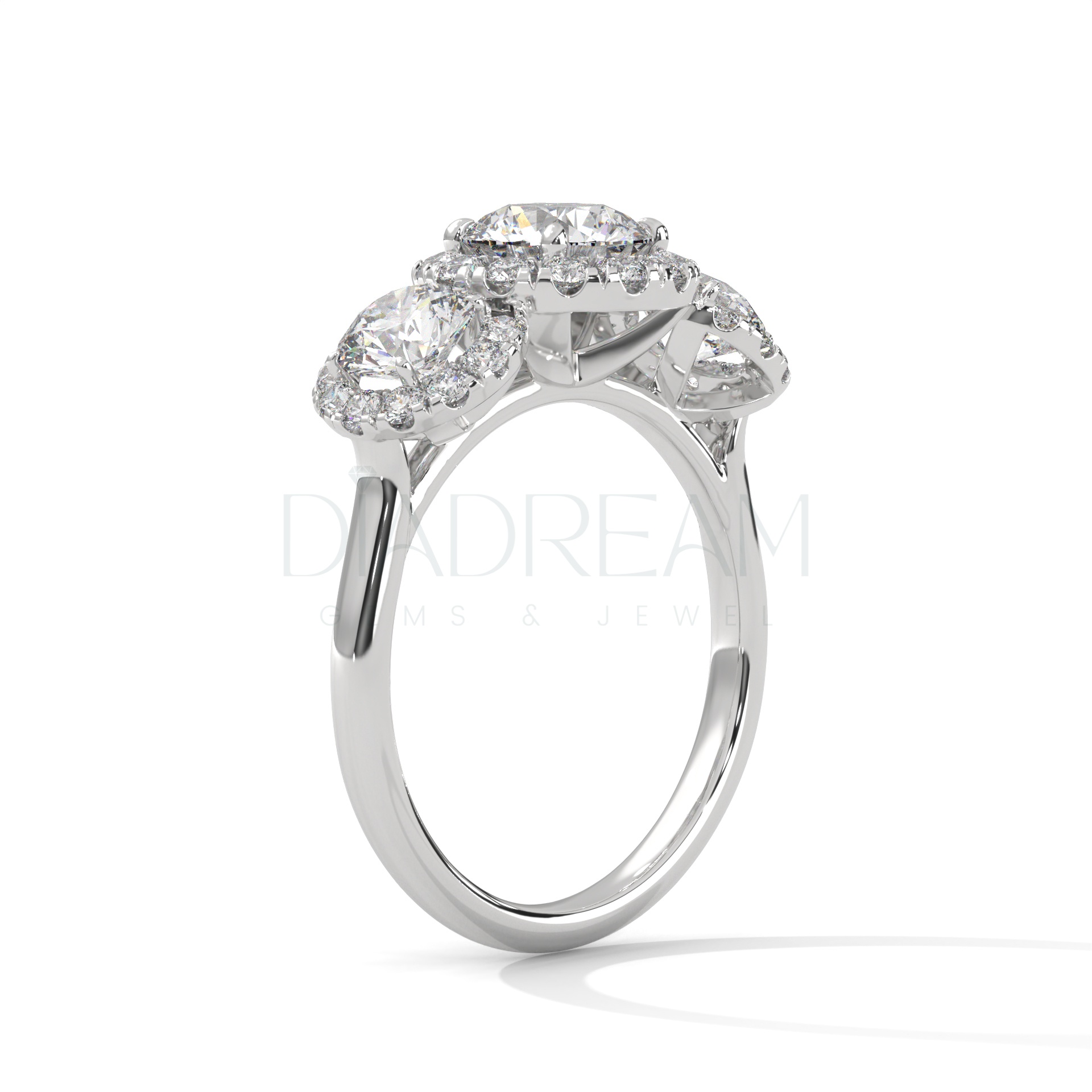 Furthermore, this exquisite ring is enhanced by a halo of sparkling round-cut moissanite side stones. This creates a breathtaking display of brilliance. Consequently, the center stone and the surrounding halo interact. This creates a captivating symphony of light and shadow. This enhances the overall sparkle and radiance of the ring.