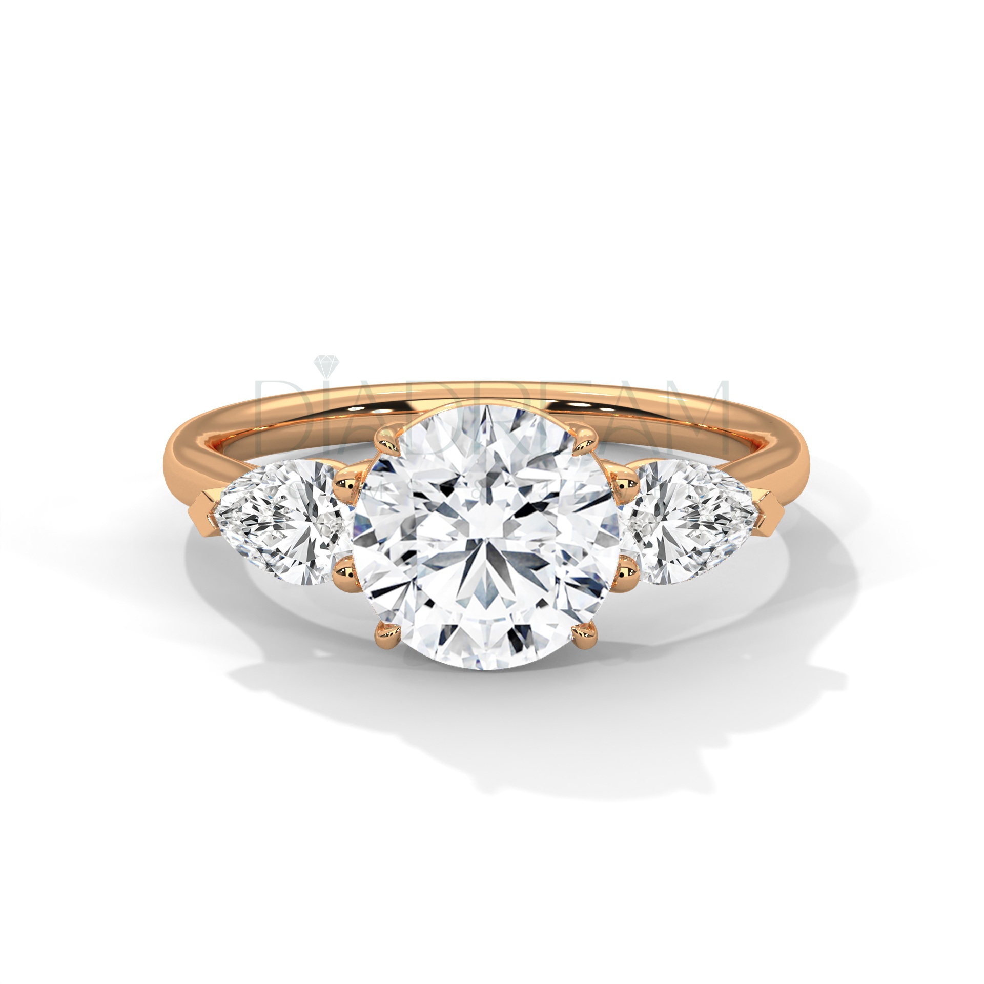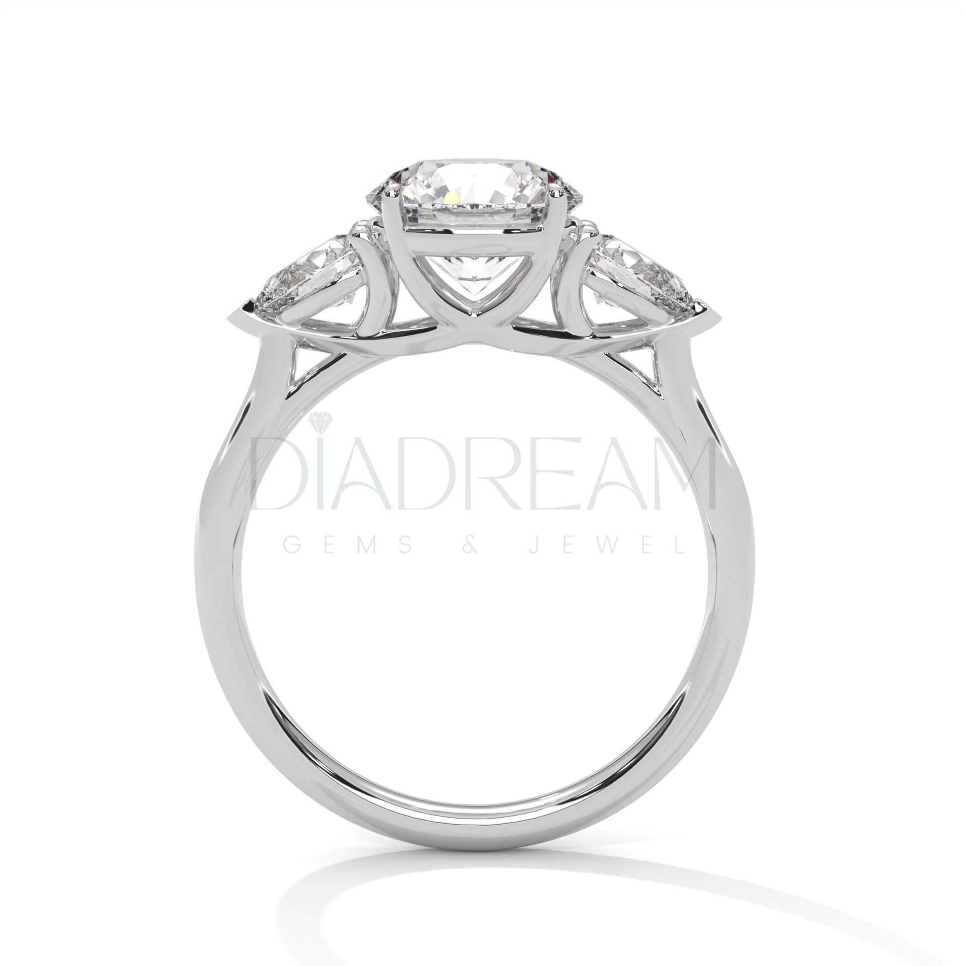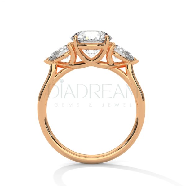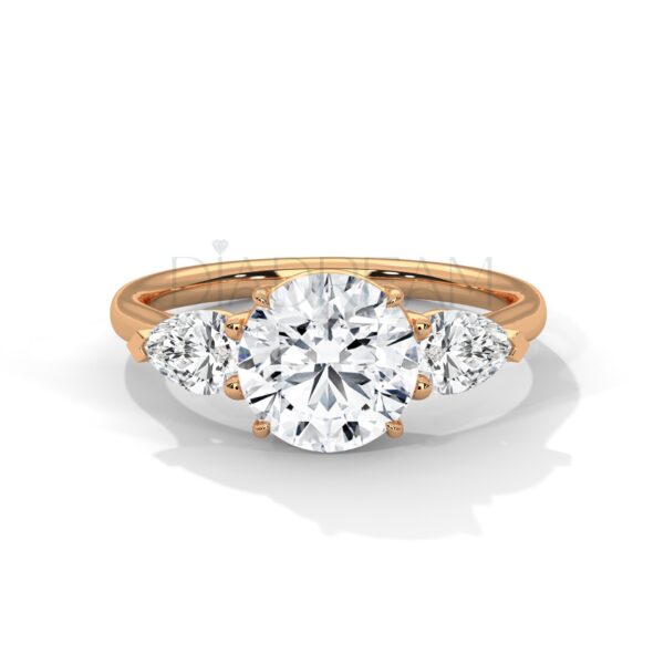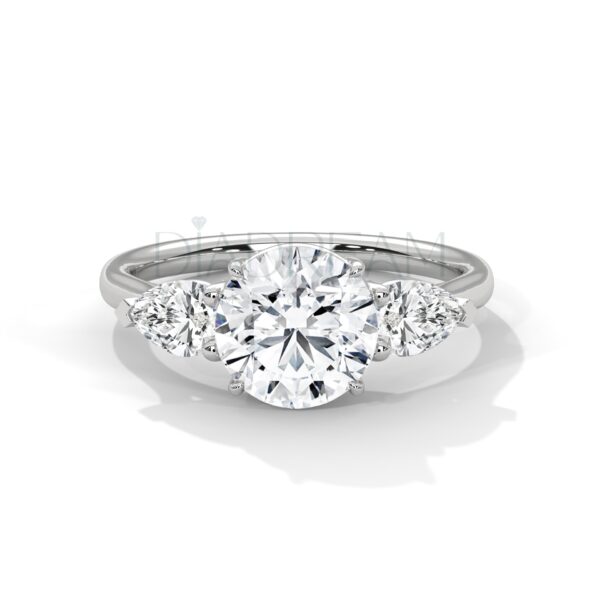 Exquisite round-cut three stone ring featuring a 2.00 CT (Approx) colorless VVS lab-grown centerpiece, accented with pear side stones. Handcrafted in solid gold or sterling silver, with customizable bandwidth and metal tone options. A timeless and sustainable symbol of elegance.