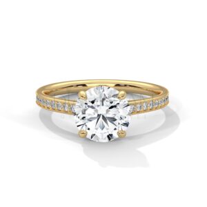 Discover the captivating beauty of our round cut moissanite ring. Showcasing a stunning 2-carat (approx.) round-cut moissanite, this ring is a testament to timeless elegance. The colorless, VVS clarity, and ideal cut of the moissanite ensure a dazzling display of light that will captivate all who behold it.